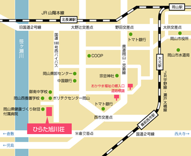 ・JR岡山駅前から岡電バス「福祉センター行き」乗車「福祉センター」下車すぐ