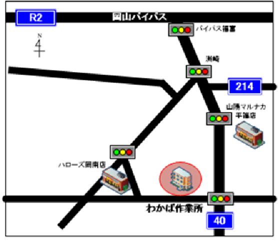 JR岡山駅から岡電バス(岡山ろうさい病院行き)に乗車。「若葉町」下車。徒歩5分。